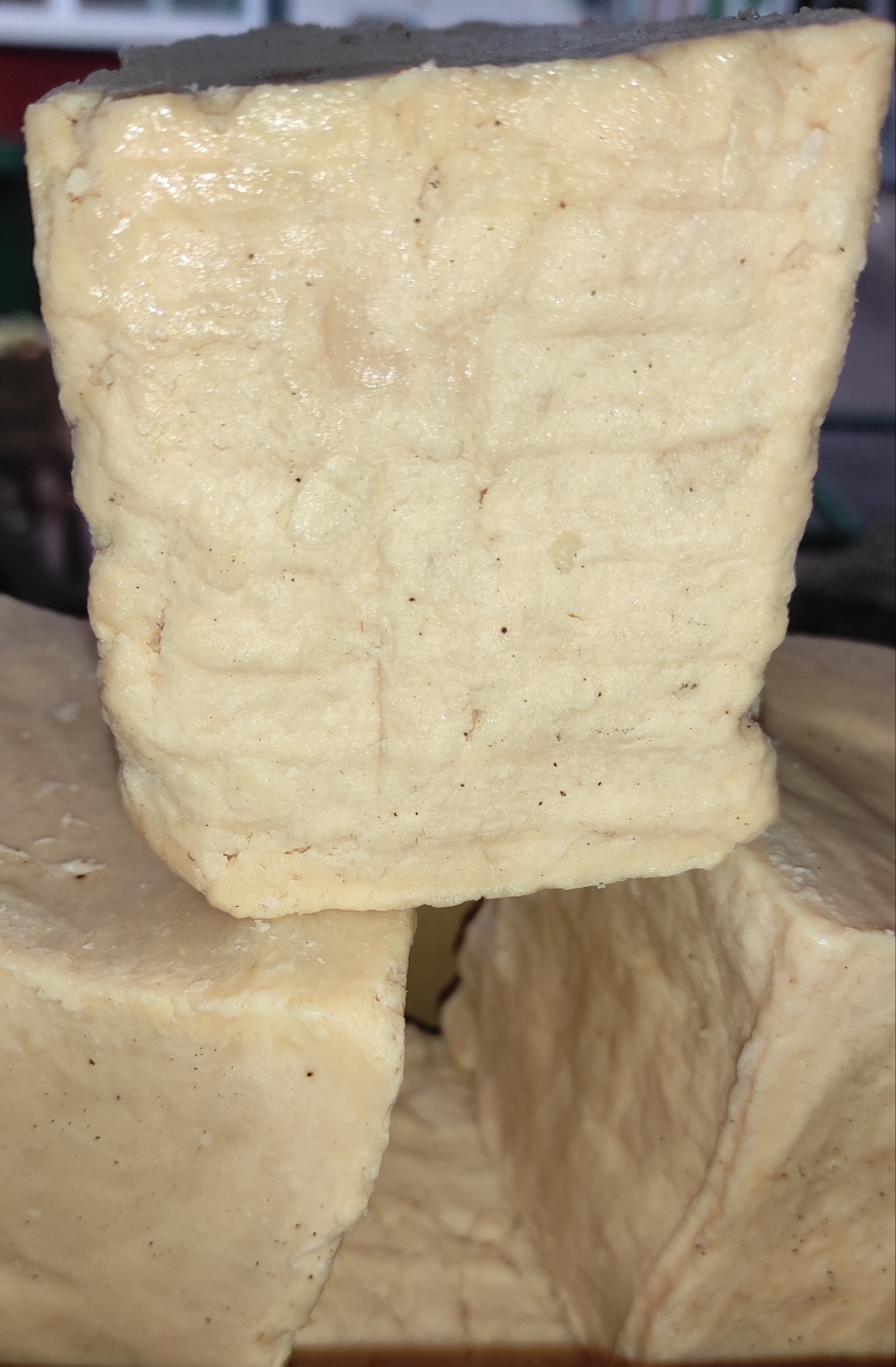 Nakon toga se izlije u rupičastu posudu obloženu vlažnom krpom. Višak vode se ocedi iz posude kroz rupice. Kada se ohladi, sapun se izvadi iz posude i odvoji od krpe a potom se izreže zategnutom žicom ili nožem.